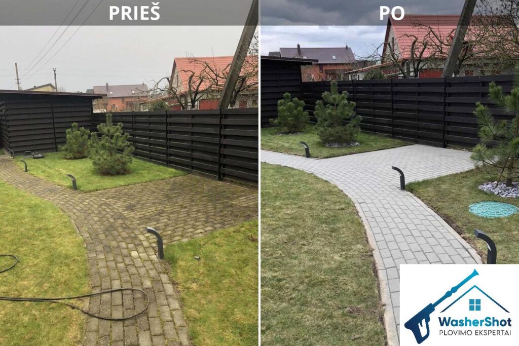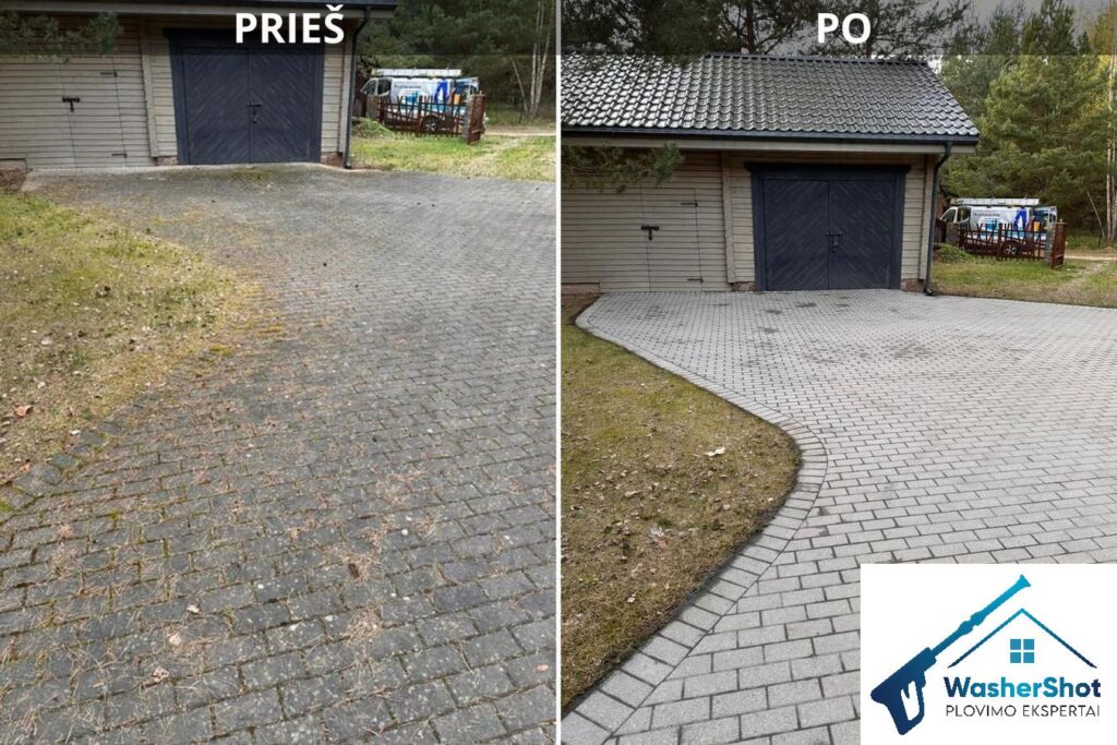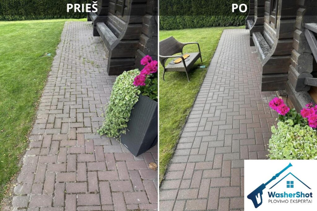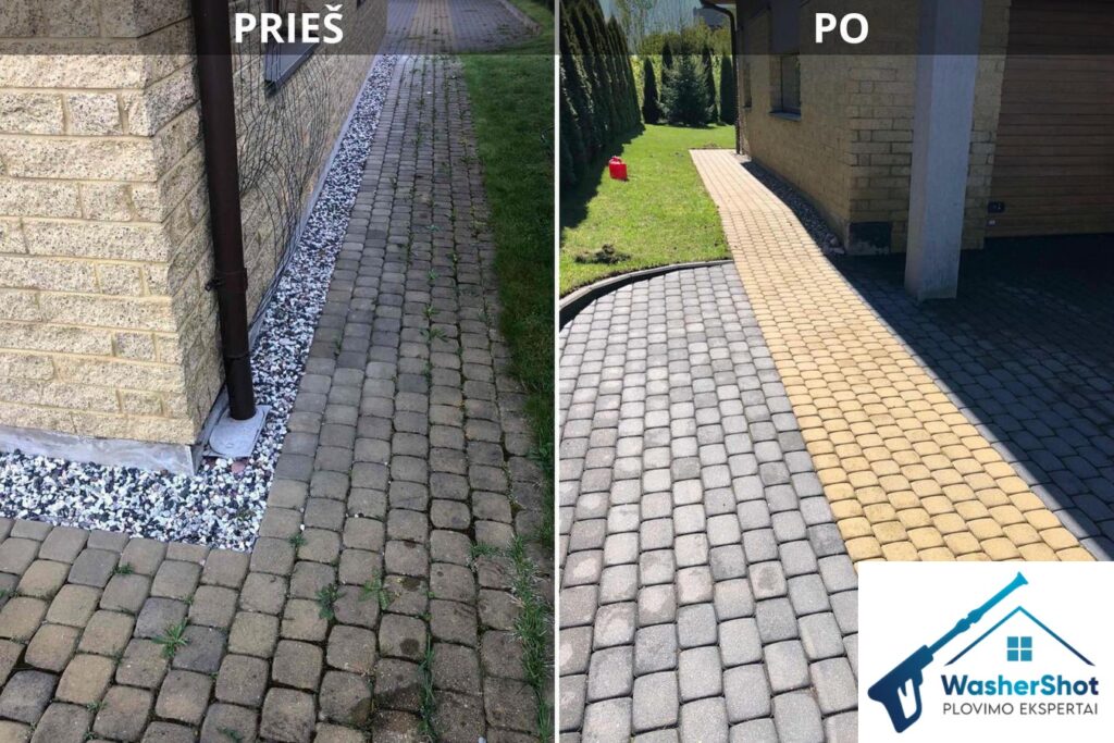 - Plovimas aukštu slėgiu (išplaunamos esamos žolės, dumbliai ir nešvarumai esantys ant Jūsų grindinio)